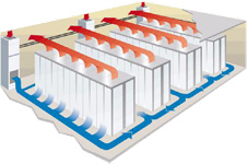 冷空气由空调下部送出,在地板平面流动,依据流体力学原理,冷空气分布在机柜的中部和下部,在机柜的周围形成冷空气的“包围”,空气受热上升,在房间内依靠“热动力”流动。计算机机柜在底部吸入冷空气,计算机或机柜本身的强制通风设备完成空气的循环,受热的空气由机柜上部排出。